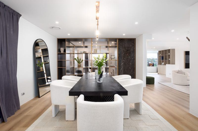 DW Creation has masterfully transformed this sleek, contemporary residence, seamlessly blending modern design with touches of timeless sophistication. Key Enhancements: The dining room now features a striking contrast of crisp white walls, rich wooden structures, and luxurious black marble accents. The open-plan design flows effortlessly, enhancing the sense of space and light throughout the home. The sleek, clean lines of the renovation maintain a minimalist aesthetic while incorporating high-end finishes and thoughtful details.